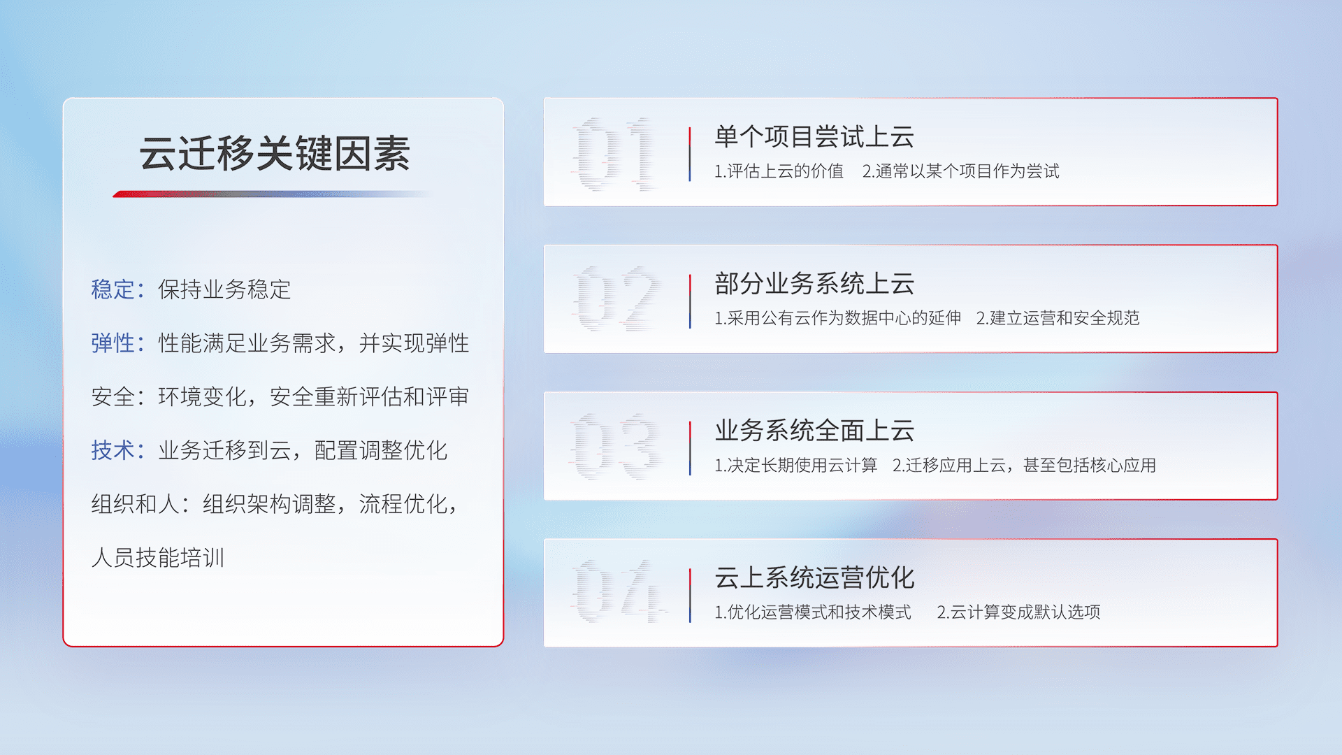 结合实际业务,,,,从规划设计、、、、云平台选型、、云原生改造、、数据迁移、、、、集成交付,,迁移全过程为客户识别最佳上云路径,,,,做好风险识别管理,,设计网络架构、、、、身份权限、、、、安全审计合规、、、操作审计、、、、日志审计、、、、监控告警策略、、多站点容灾设计等,,,,对云上基础设施进行整体规划,,提升IT治理水平,,,以满足弹性、、、、高可用、、、、高性能的需求。。。。