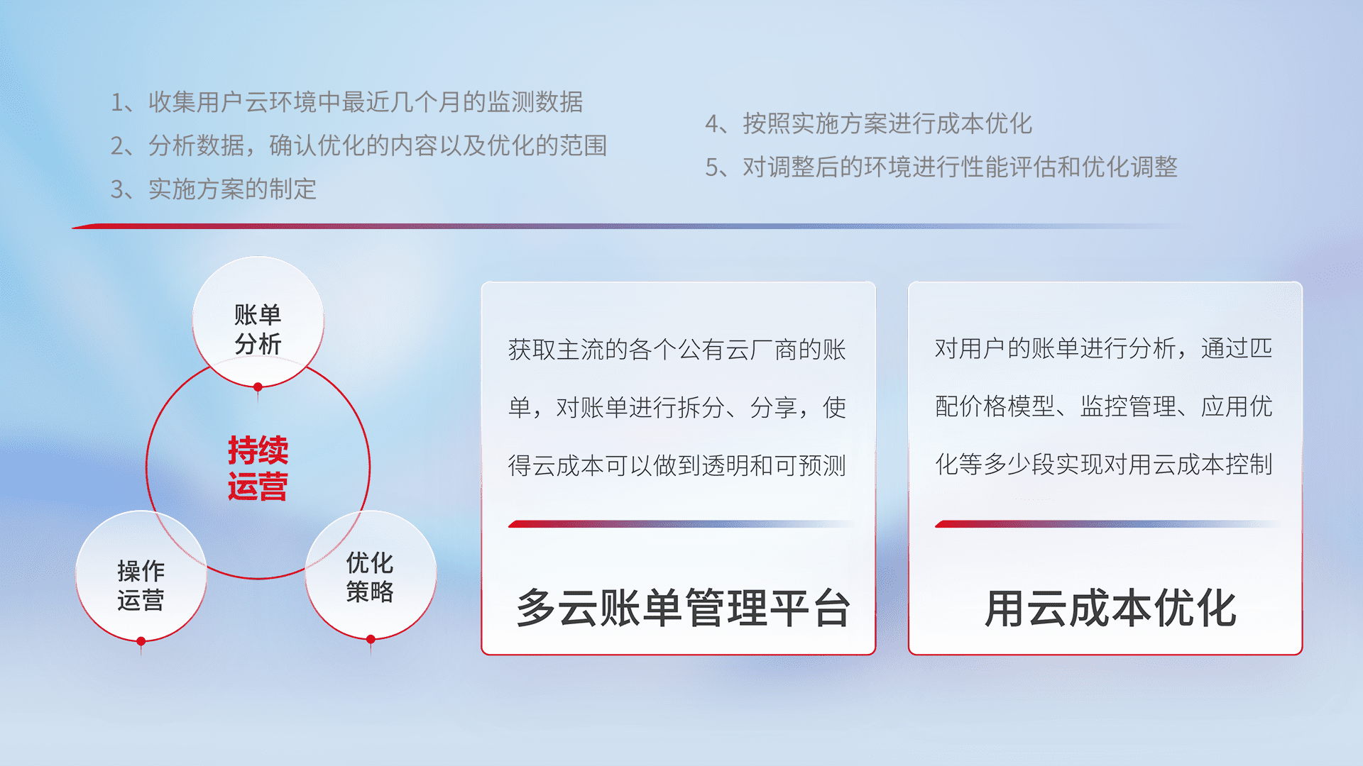 通过多云纳管,,,以统一的资源数据模型把客户的云资源进行抽象和封装,,进而实现对多云资源的统一操作,,,保障云资源管理的可靠性、、、、稳定性与可用性。。。量身定制化运维内容,,,配置、、开发运维、、、、补丁管理、、备份、、、、监控、、、、认证和访问管理、、审计和日常巡检等,,,保障在用云过程中的可靠度,,稳定度以及高可用率。。。。